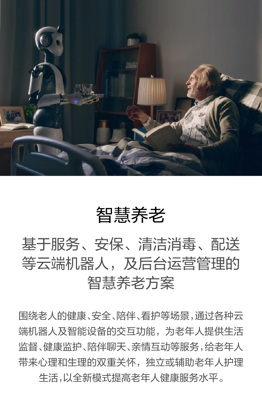 围绕老人的健康、安全、陪伴、看护等场景,通过各种云端机器人及智能设备的交